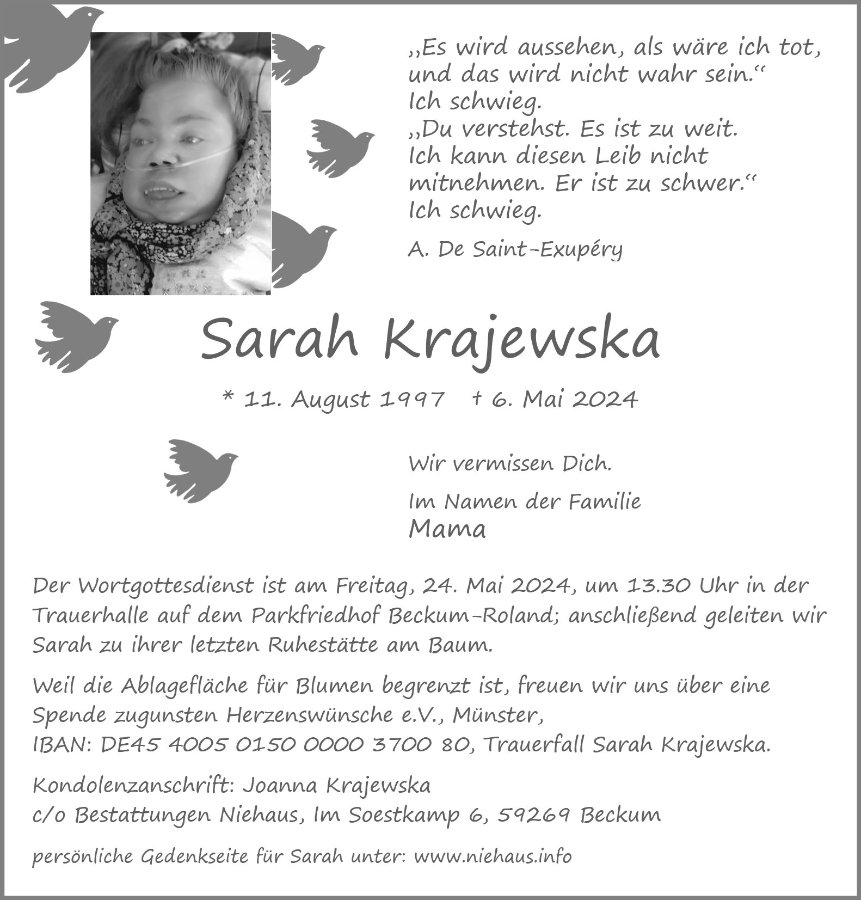 In der Todesanzeige steht ein Zitat aus dem kleinen Prinz. Daß man den Körper zurücklassen muß, weil der Weg zu weit ist. Manchmal ist es auch gut, ihn zurückzulassen, weil er eine Last geworden ist. Durch das Zurücklassen ihres Körpers hat Sarah eine Freiheit bekommen, die ich ihr von Herzen wünsche. Alles alles Liebe ...